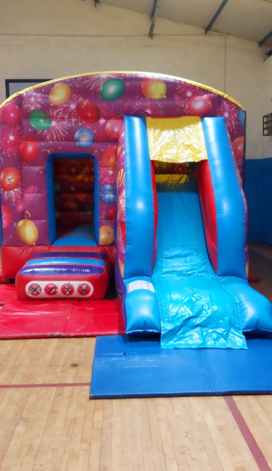 Bouncy castle with front slide party theme. This combi is great if space is an issue and you want a bouncy castle with a slide. It is sure to keep the children entertained for hours on end. suitable for indoor and outdoor hire.